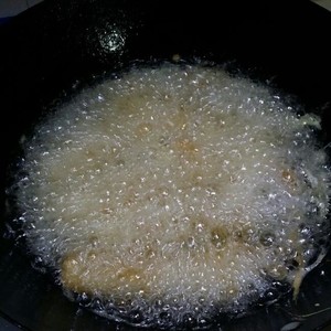在油锅里放一点食用盐防止油花四溅,把裹上鸡蛋的带鱼放到油锅里炸至金黄后夹出。