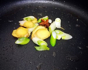 锅内留少许底油,加入姜片,葱,八角,小火炒出香味。