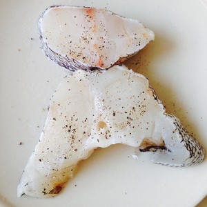我是用的冰冻鳕鱼,新鲜的当然更好。解冻后用厨房纸吸掉多余水份,用盐和黑胡椒,一点点生抽腌15分钟