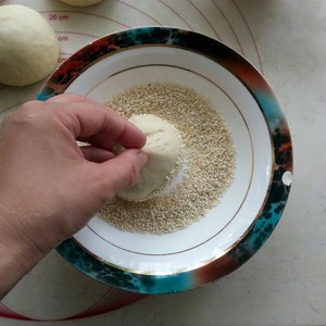 手捏收口,将面团在白芝麻里滚一下。