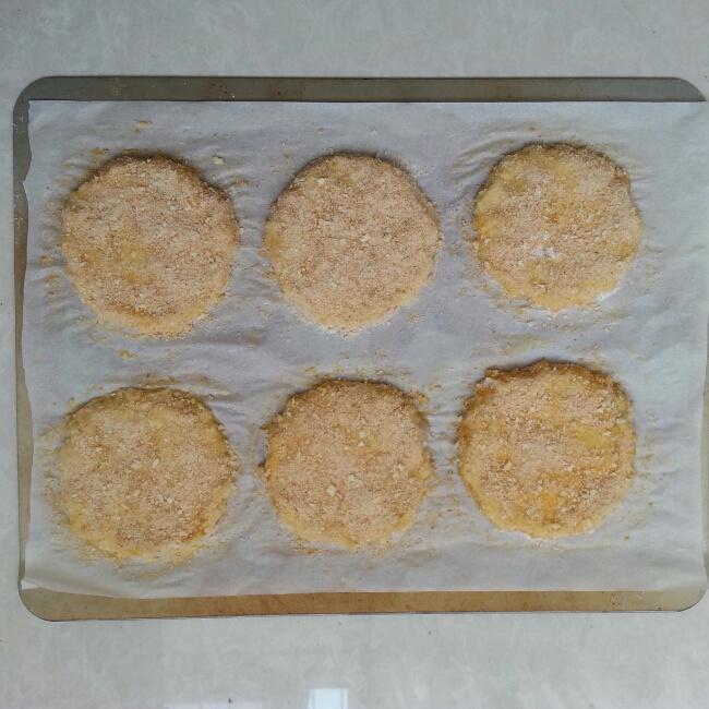 这个环节最尴尬,本来操做是参考一本书来的:把肉饼拿起 在面粉里两面粘一下,再放在蛋液里让两面裹上鸡蛋液,最后两面再粘上面包屑。结果到操作时发现肉饼发散,根本不可能拿起来。临时想起一张肉饼用一张保鲜膜包好冷冻到硬应该操作就比较方便了,但是我不想再等了,所以就变成直接撒了。