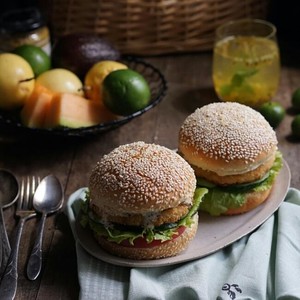 将面包横剖成上下两半,下面一片涂沙拉酱,上面依次码番茄片 生菜 黄瓜片 肉饼,涂上调味酱,再将另一半面包盖上。如果有自己喜欢的菜 洋葱 西芹神马的 一样可以加进去。好,忙乎半天 现在可以啊呜开动了。