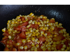 炒锅加入黄油烧热,加入西红柿炒出红油!之后加入玉米粒一同翻炒!