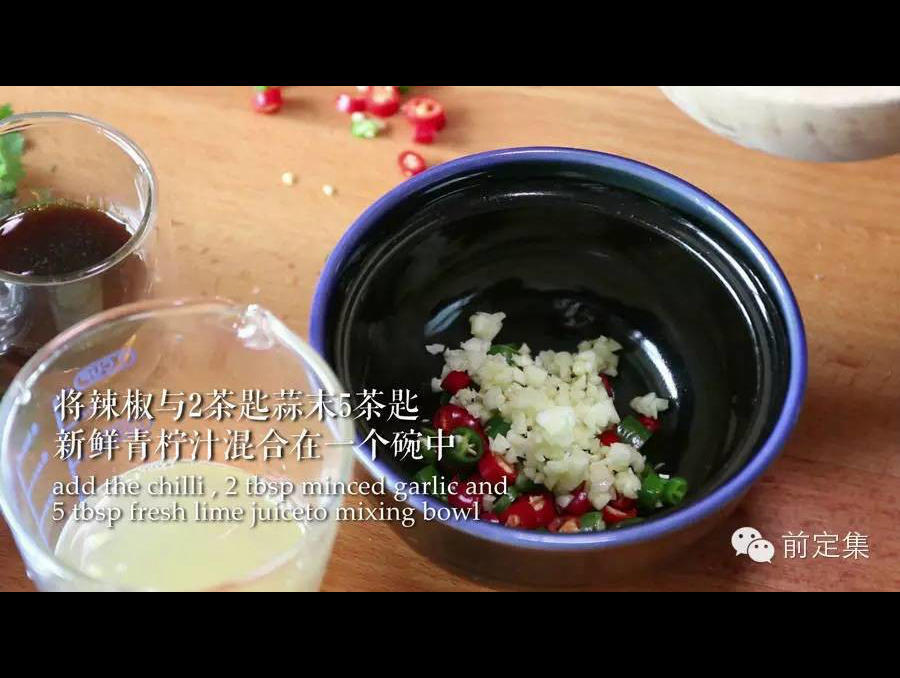 将辣椒与2茶匙蒜末5茶匙新鲜青柠汁混合在一个碗中