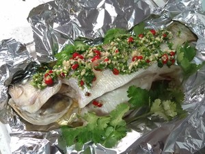 烤鱼的同时制作酱汁,小米椒、香菜切碎。蒜切末。剩下的柠檬挤汁混合鱼露、糖,加入备好的小米椒、蒜、香菜。味道可按照自己的口味调整,但不要偏离了泰式口味。