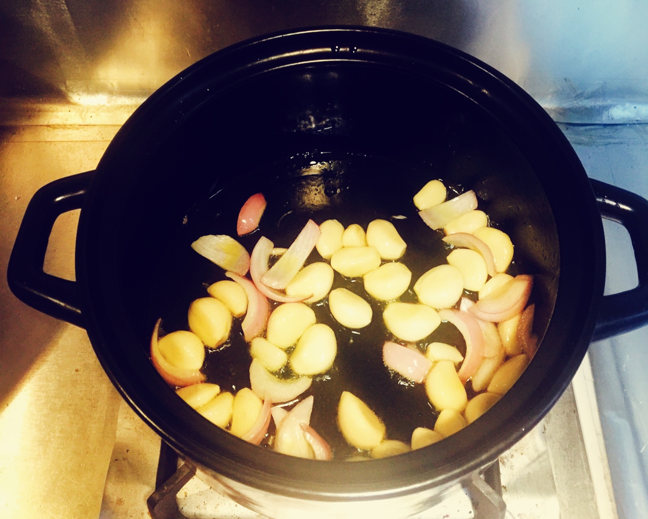 锅内倒油,油冒烟,放入蒜,洋葱,炒出香味
