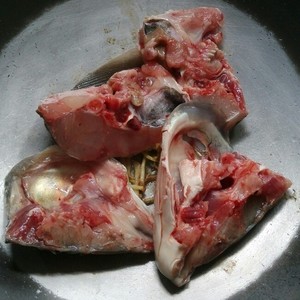 等锅中姜丝爆香后,倒入鱼头,煎炒一会。