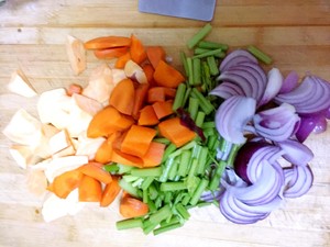 把红薯、胡萝卜切滚刀块,芹菜切段,洋葱切好,大蒜切片。