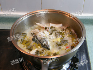 加入鱼腩,鱼尾,及炒好的酸菜类,加入盐(可不放),鸡精,白胡椒粉。