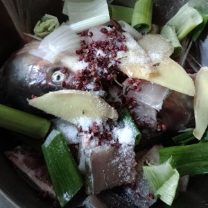 放入葱段五六段,姜片四五片,花椒一小撮,盐适量。