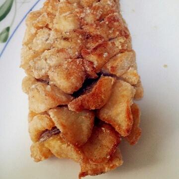 草鱼肉用刀切成斜切成粒粒的松子状,千万不要把鱼皮切断,使每片鱼片间只有鱼皮相连,草鱼肉用盐、白胡椒粉,鸡粉腌制入味