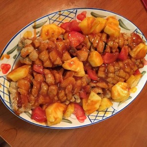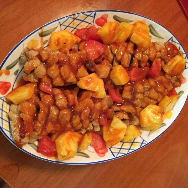 锅里的油盛出,不用洗锅,生粉加少许水混合,番茄酱,醋,生粉水,糖,倒入锅中烧开,等待酱汁变浓稠,再加入菠萝,番茄,快速翻拌,淋上摆好的鱼上即可