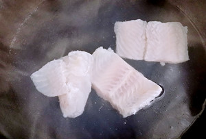 锅里煮开水后将龙利鱼抹上些淀粉后下锅焯一下,主要是为了将鱼紧一下,以免蒸的时间出太多水