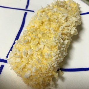 然后逐个拿出鱼块,逐个裹鸡蛋液后再沾匀面包糠。