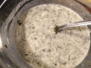将天ぷら粉和冰水混合,再加入苔条碎调匀,做成面衣。天ぷら粉和冰水的比例是1g:1.6ml;