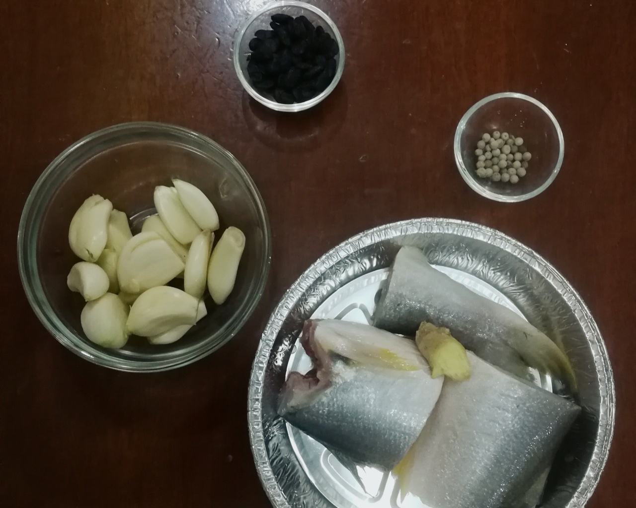 将鱼洗干净,撕去鱼腹内黑膜。蒜去皮。