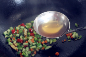用汤勺来做为标准,加入半汤勺料酒,2/3汤勺酱油,1.5汤勺白糖,1汤勺白醋,翻炒一下,加入7-8汤勺的清水。