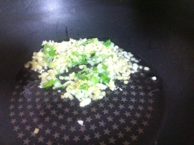热锅放油少许,油烧热放入葱姜蒜沫煸炒出香味