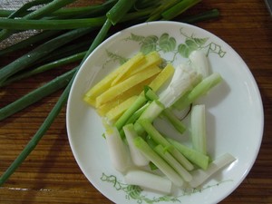 绿葱丝的做法,是取绿色葱管,用小刀剖开,划1毫米细丝,它就会自动卷起来变成好看的绿葱丝,放在鱼上很漂亮。