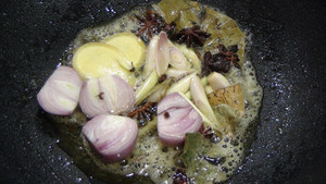 将干葱头,姜片,八角,香茅,香叶等炒香。