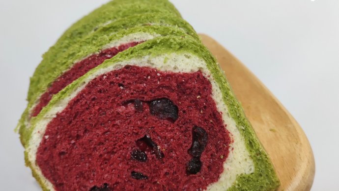 哈哈哈~切片还不错吧~夹着一点蔓越莓干,特别像西瓜~大爱这款有颜值的吐司啦~西瓜吐司的做法窍门