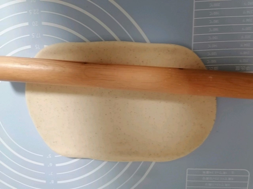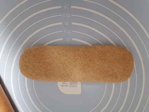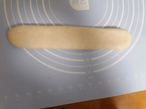 做法分解3:先做全麦面包在外面的馒头,取一块全麦面团搓成20厘米左右的长条按扁