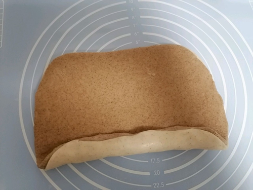 做法分解6:再取一块黑全麦面团和上面全麦面团一样擀成长方形