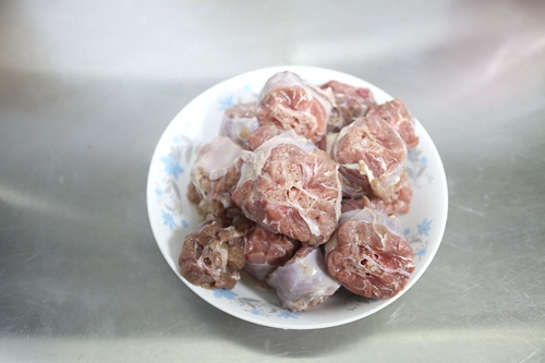 做法分解5:随着水温的上升,浮沫逐渐涌现;将牛尾从开水处捞出,避开浮沫,这样就不用再清洗了;
