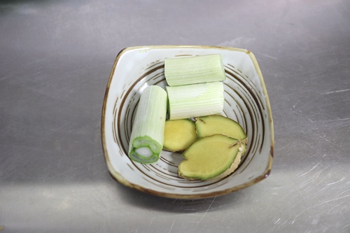 做法分解6:焯牛尾时,土砂锅里倒适量水,烧热;牛尾焯水后直接捞入热水中,再放上姜片、葱段;