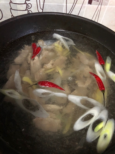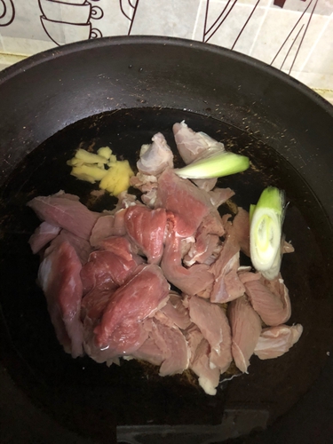 做法分解4:把切好的羊肉冷水下锅,放入几片大葱和一小块拍碎的姜。少许料酒去膻味。