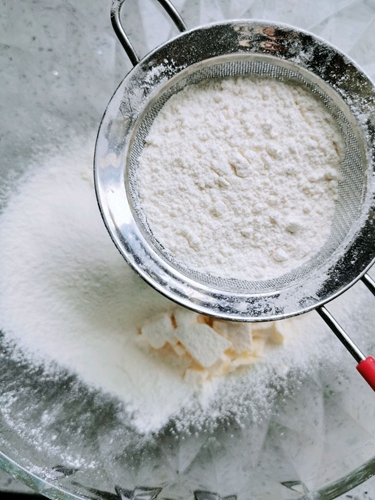 做法分解1:1.黄油室温软化切丁,筛入低筋面粉,然后搓成小颗粒状。