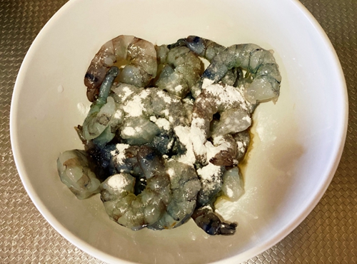 做法分解4:虾仁加入适量盐,料酒和淀粉,搅拌均匀后放置十分钟左右