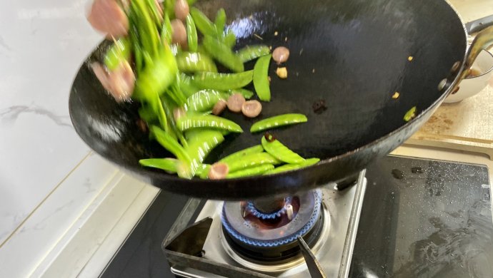 做法分解6:再放入焯过水的荷兰豆,翻炒