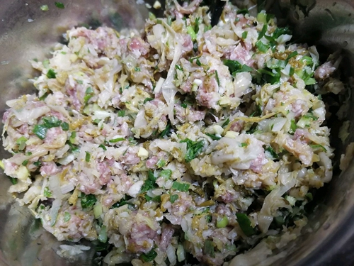 做法分解2:搅拌均匀,我没有称重,酸菜这个品种吸油,所以要比青菜馅的多放肉和花生油,或者熟油,搅拌后能看到比较多肉块基本差不多