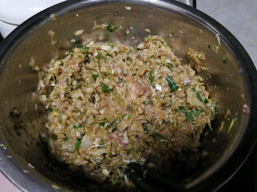 做法分解4:加入花生油,搅拌均匀,看着菜馅油亮的基本就可以了,闻闻味道,很大的肉菜香味