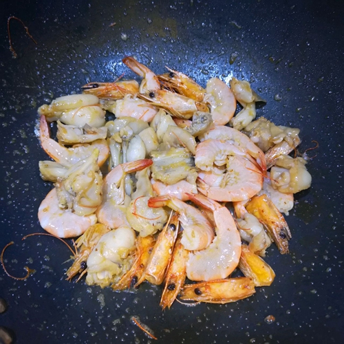 做法分解6:倒入虾继续翻炒至虾变红,全部乘出备用