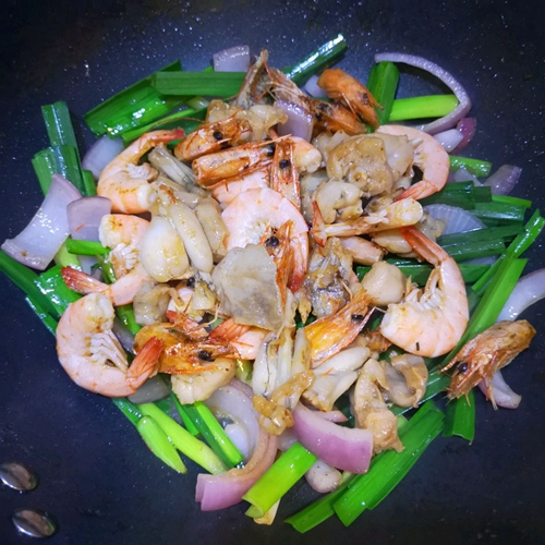 鲜虾150克,田鸡200克,蒜苗150克,洋葱半个,蚝油2勺,酱油2勺