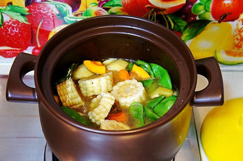 做法分解5:加入适量的水,放入玉米。喜欢喝汤汁的可以多加点水,否则适量就好。这个汤汁要比南瓜汤还好喝。