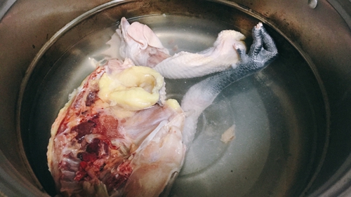 做法分解1:鸡用清水洗干净,加料酒,下锅焯一道。