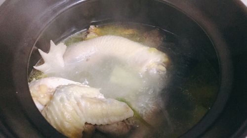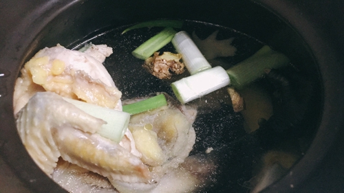做法分解2:焯水的鸡洗净后,凉水下锅,加葱段,姜块。用砂锅煲汤,先小火后转中大火,水开后转小火炖1个小时以上。