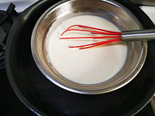 做法分解3:鲜奶、奶油、、椰子汁、糖霜隔热水搅拌均匀,让糖霜和牛奶、奶油、椰子汁充分融合