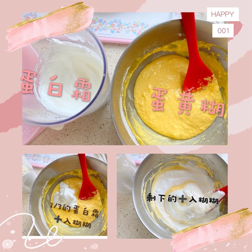 做法分解5:4:取1/3蛋白霜到蛋黄糊中翻拌均匀再把它们全部倒回蛋白霜中翻拌均匀