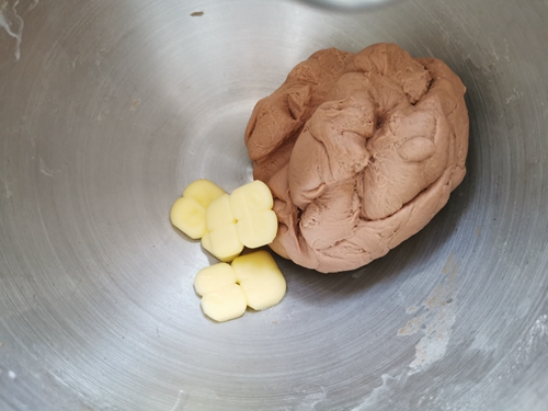 高筋面粉200g,牛奶100g,淡奶油45g,盐2g,可可粉10g,细砂糖25g,酵母2g,黄油20g,蜜豆适量