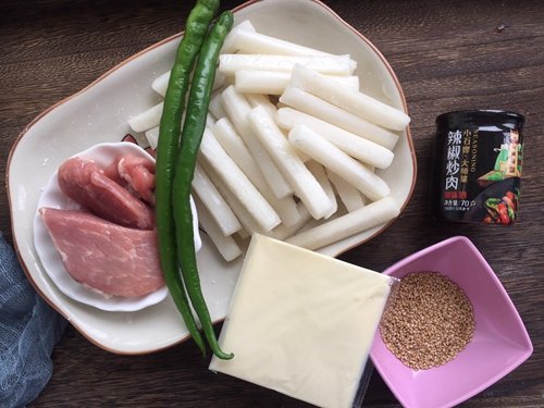 年糕条300克,瘦肉100克,二荆条2个,芝士1片,白芝麻15克,小石窖辣椒炒肉料2勺
