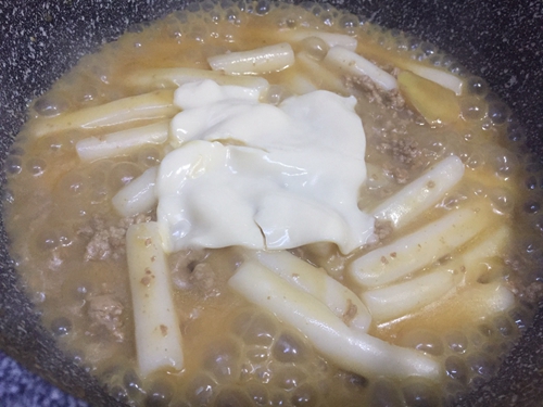 做法分解6:将年糕煮至软身,锅中水剩少许。放一片芝士煮至融化。