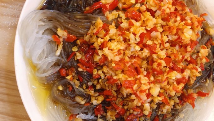 做法分解7:热油浇在蒸好的蒜蓉上