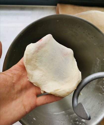 做法分解5:高速搅打面团四分钟左右,查看面团状态,面团达到扩展状态时通常会听到面团抽打搅拌缸的啪啪声,到可以拉出手套膜时打面完成