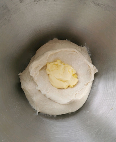 做法分解4:面团中间包入室温软化好的黄油,继续低速搅打面团,面团会变得软烂,继续搅打两三分钟至黄油被面团吸收,面团重新变得光滑