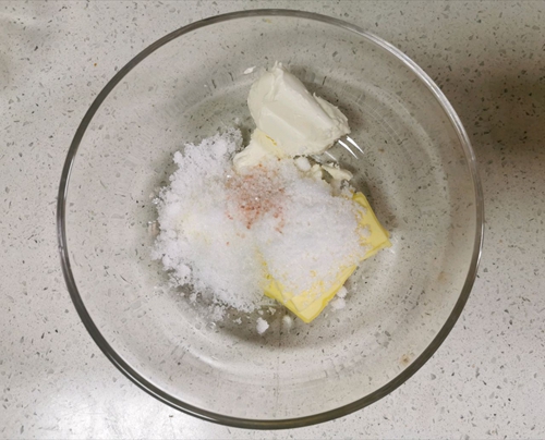做法分解8:先将室温软化好的黄油和奶油奶酪,砂糖,海盐倒进碗中,搅匀至顺滑