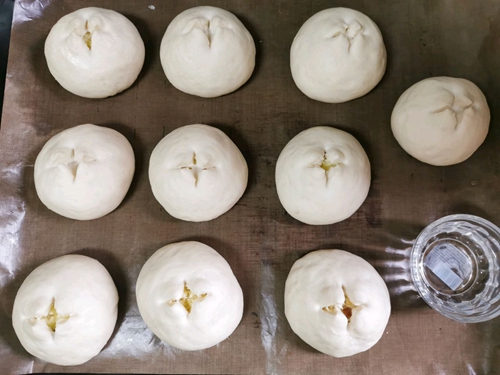 做法分解17:放在铺好硅油纸的烤盘上进行二发,约40分钟左右,小面包长大1.5倍